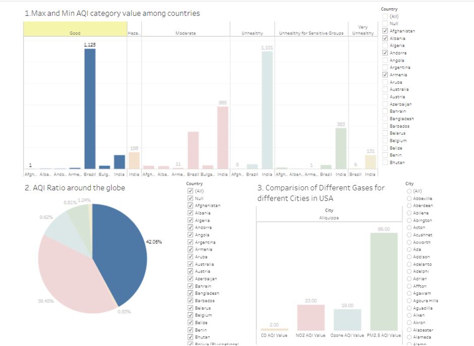 This project establishes a comprehensive air quality monitoring system integrating both static dataset analysis and real-time data collection through an IoT device. The static dataset, inclusive of AQI values and pollutant categories, undergoes analysis on Amazon Web Services (AWS) and visualization on Tableau. Concurrently, an IoT device, employing the ESP8266 microcontroller and environmental sensors, collects real-time data on diverse air quality parameters. This IoT-generated dataset is analysed and visualized on the ThingSpeak platform, offering dynamic insights through graphical representations. The project envisions future integration of email notifications for threshold breaches. This can provide timely alerts when air quality parameters surpass predefined thresholds, facilitating swift responses to environmental concerns and contributing to heightened environmental awareness.