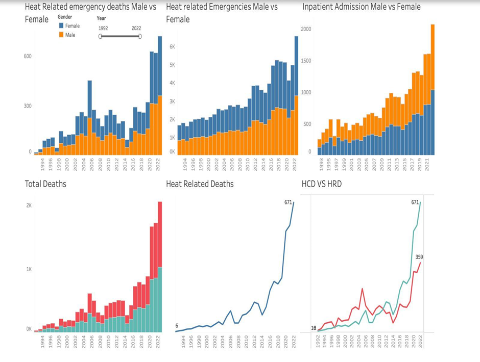 The “Phoenix Summer Climate Trends and their Impact on Humans” project aims to develop an interactive dashboard to illustrate the correlation between climatic trends and human health in Phoenix, Arizona, from 1950 to 2023. It focuses on analyzing historical climate data, particularly during summer months, to understand extreme weather’s influence on the local population and mortality rates. By comparing urban and rural climate conditions, the project seeks to uncover disparities and inform public health strategies. Rooted in data-driven analysis, the initiative aims to enhance decision-making and foster resilient planning to address evolving climatic conditions, emphasizing comprehensive methodologies and user-friendly visualization techniques for stakeholders.